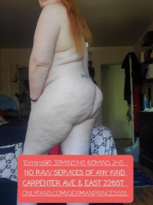 INCALLS ONLY BRONX...... 25 and up....... NO DEPOSIT NEEDED........ . 2 TRAIN TO 225ST OR IF DRIVING EX.233ST.... .. . 🚨CARPENTER AVENUE AND EAST 226ST ...... 🚨NEAR BRONX BLVD ....(NOT WHITEPLAINS RD) ....... ADDRESS WILL BE GIVEN WHEN U HAVE PARKED ..... . 15MINS 90....... 30MINS 140.......... 60MINS 240 2ROUNDS ........... STRAP ON PLAYin 15MINS IS 125..... 15MINS VIDEO SESSION 70...... OUTFIT REQUESTS 20.... . NO BBBJS........ NO G.F.E............ NO 3SUMS............ NO COUPLE ..... NO RAW SERVICES OF ANY KIND ..... ... . IG GERMANPRINCESS53......... SNAPCHAT sbunnny931............ ONLYFANS.COM/GERMANPRINCESS51.... . .. 7 AM TO 7PM EVERY DAY 25 & UP.. If you are more than 10 minutes late you cannot expect me to be available I go by appointment only........